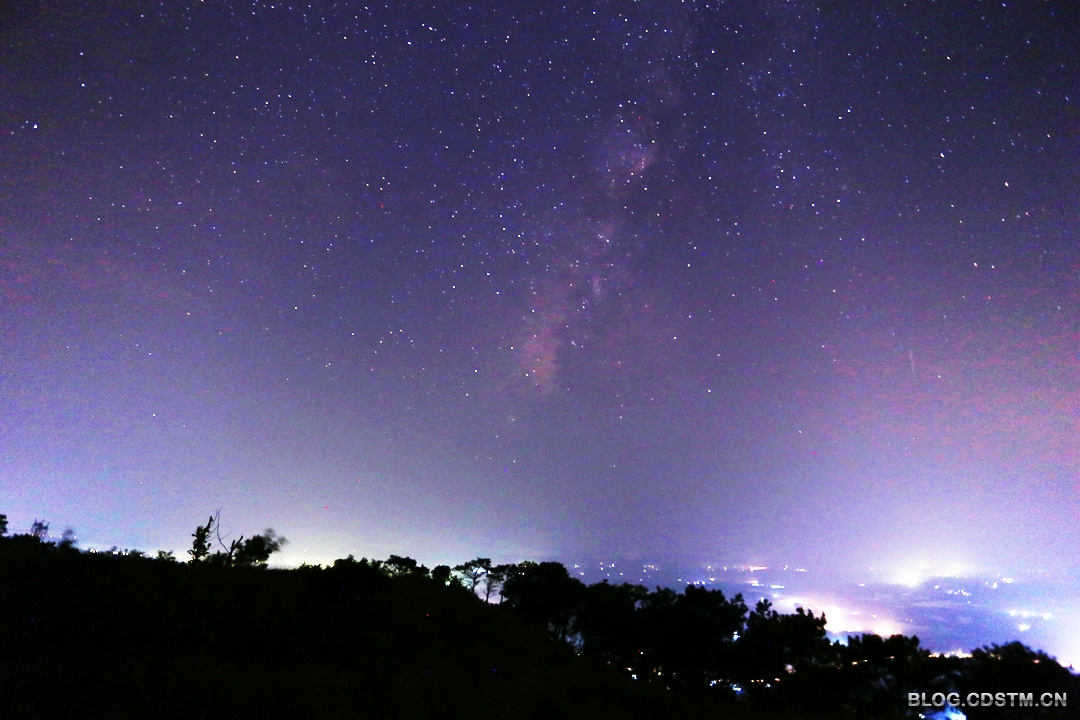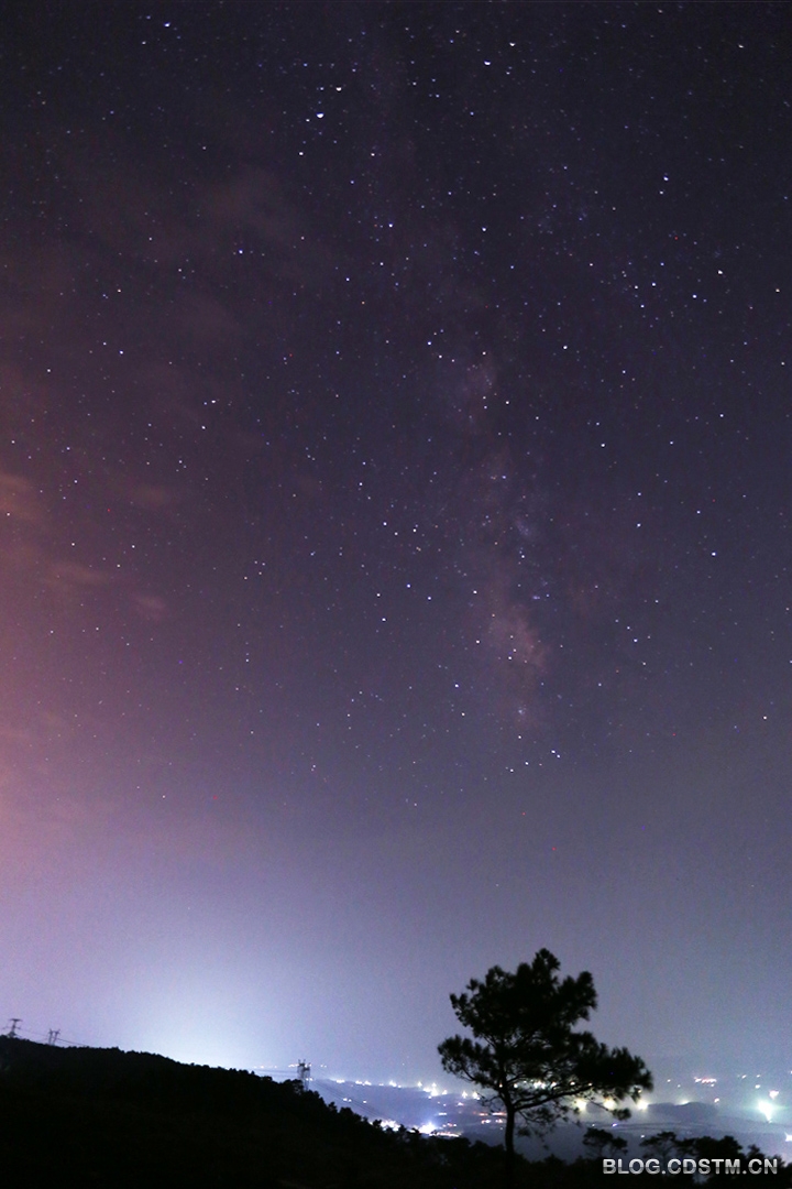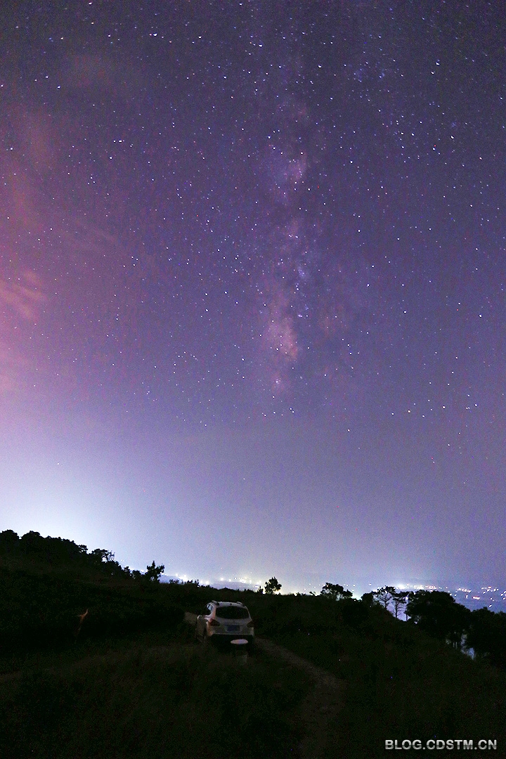 2014年9月23日下午下班后,和朋友赴离南宁2小时车程的横县圣山“追星”。车到伶俐至南阳路段,因修路遭遇堵车,车窗外的天空灰蒙蒙一片,心都凉了半截。但我们坚持继续前行。车到山下时仍少有星星出现。也许天老爷被 我们的执着所感动,20点到达山顶时,云散天开,满 天星斗,虽然天边仍有少量雾气,不够通透,但银河还是出现了,拍星轨更不成问题。于是几位“追星”发烧友架起脚架,将镜头对准银河、对准北极星开拍。22点16分才收镜回邕。