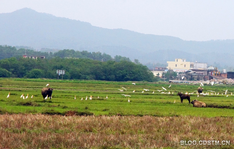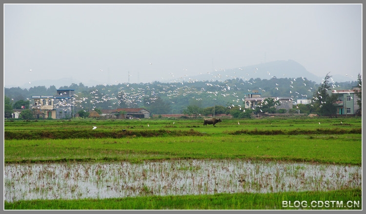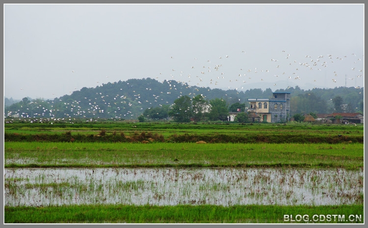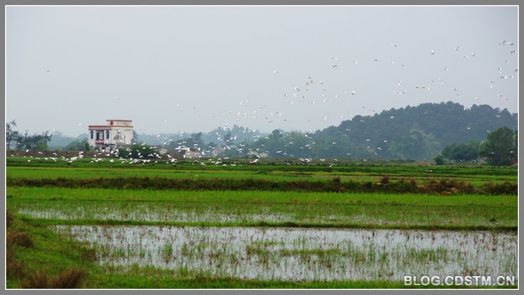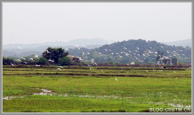 广西防城港市江平一带生态环境良好,是鹭鸟聚居的地方。离著名风景区金滩不远有个闻名中外的万鹤村,更是鹭鸟的天堂。2011年4月16日,应摄友郭超平、周斌之邀,驱车200多公里,去那里拍白鹭。刚踏入通往金滩的路,就见路两边的绿野中,有上千只白鹭在觅食。我们想靠近一点拍照,谁知惊动了白鹭,它们振翅盘旋,飞向远方,极目望去,像银色的絮片满天飘舞,漫过田野和青山,充满诗情画意。傍晚,它们又成群结队飞回林中,我禁不住吟出以下几句——