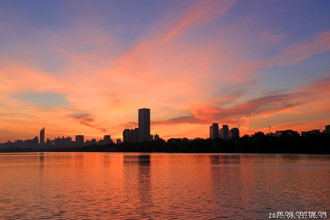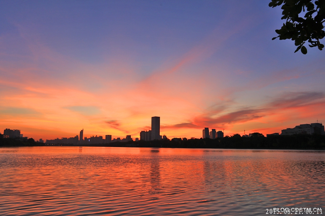继8月13日、16日之后,今天(8月21日)南宁又出现似火的朝霞,且比前2日更灿烂。天空也比前2天通透。因脚架出故障,全部手持拍照。最后一张是5点56分拍的,湖边的灯还亮着(南宁天亮比北京晚1小时左右),ISO:5000,F:4.5,S1/30秒。