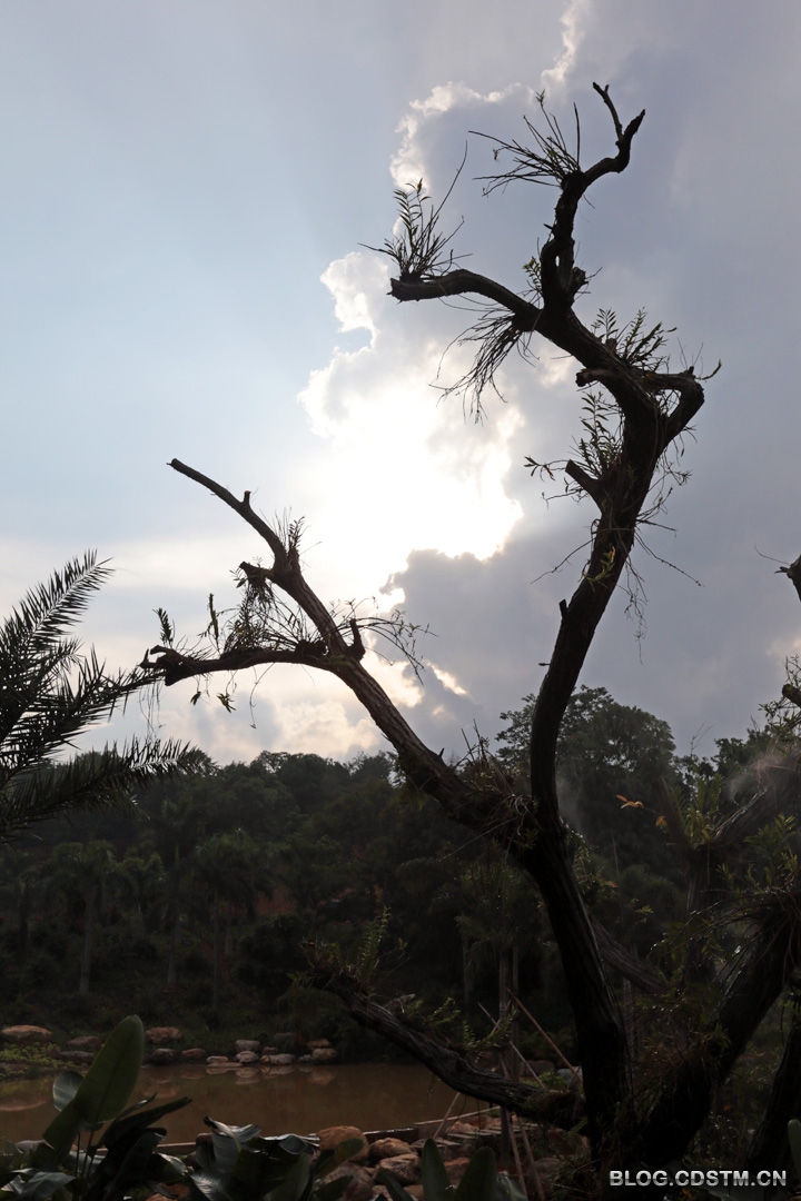 2015年9月18日17点27分摄于南宁市青秀山兰园。当时,一团积雨云冲天而起,一株种有石斛的板栗树插入云中,似是在云端起舞。