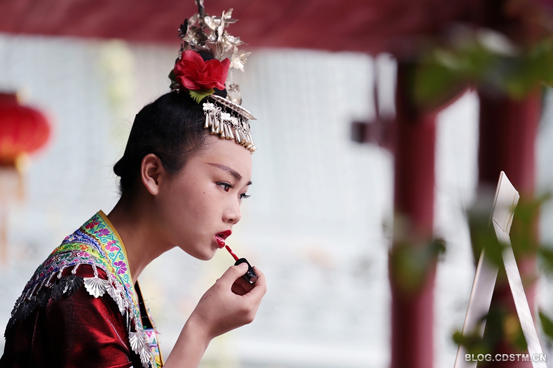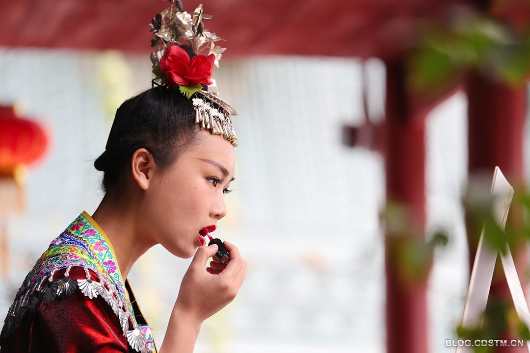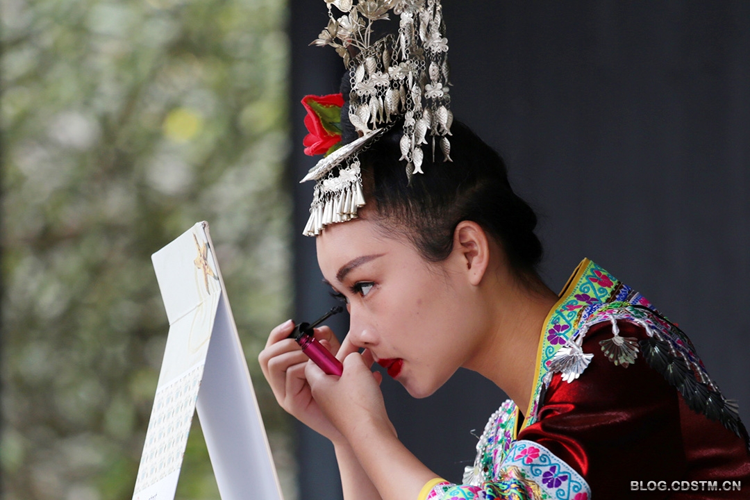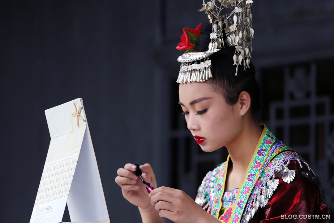 位于广西博物馆后边的民族文物苑,几乎天天都有苗家姑娘为前来旅游观光的客人演出。演出之前,这些来自农村的苗家姑娘都要进行精心的化妆,向客人展示最美的姿容。这是3月4日下午,其中一个苗妹正在化妆的情景。