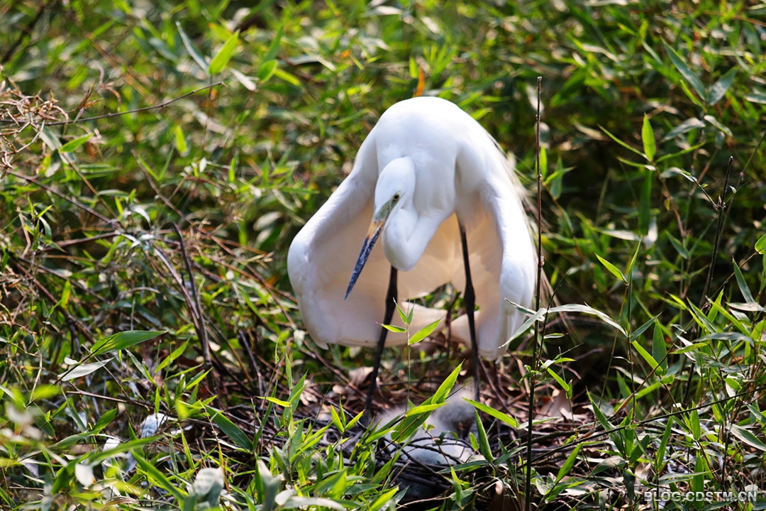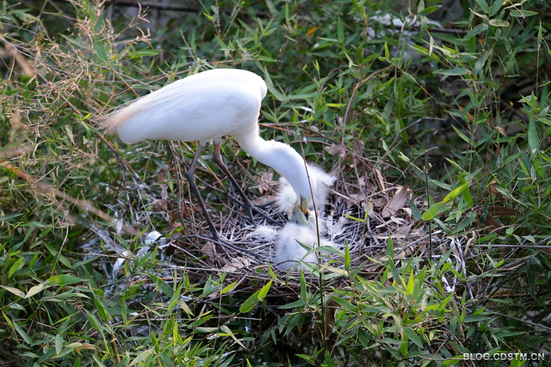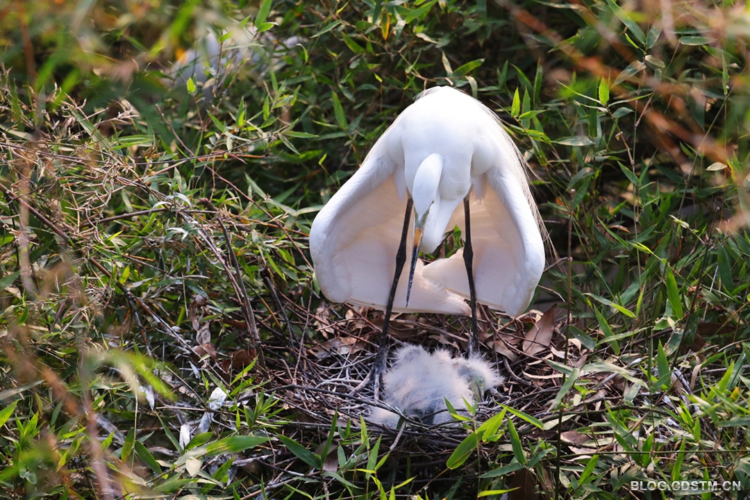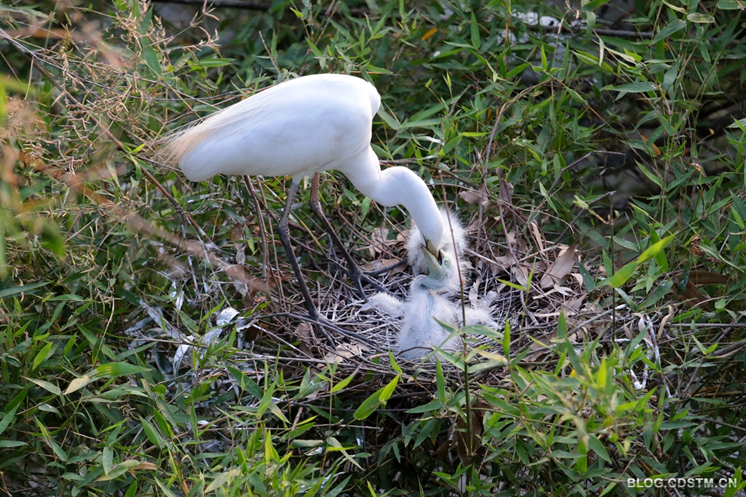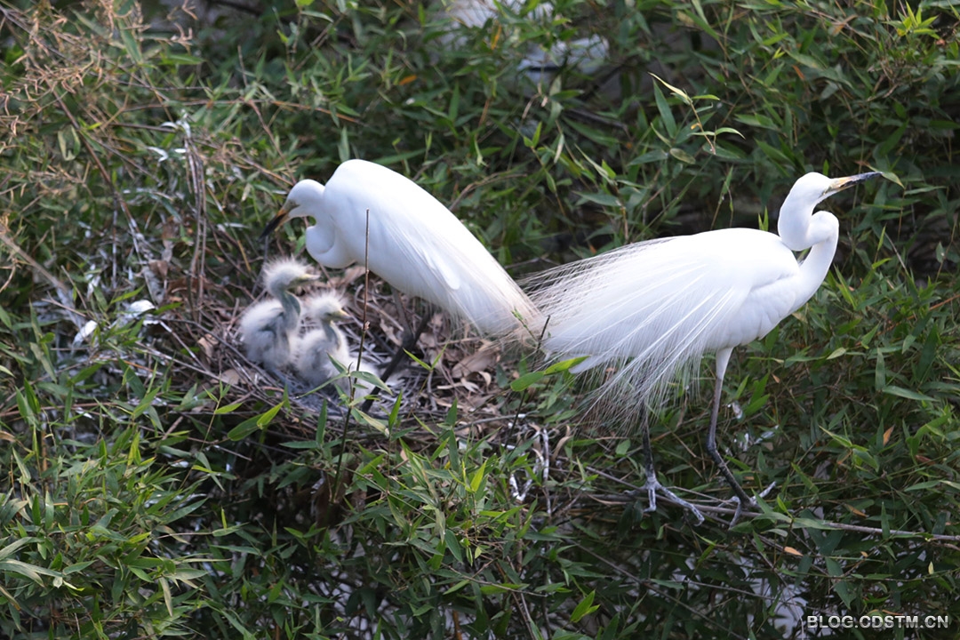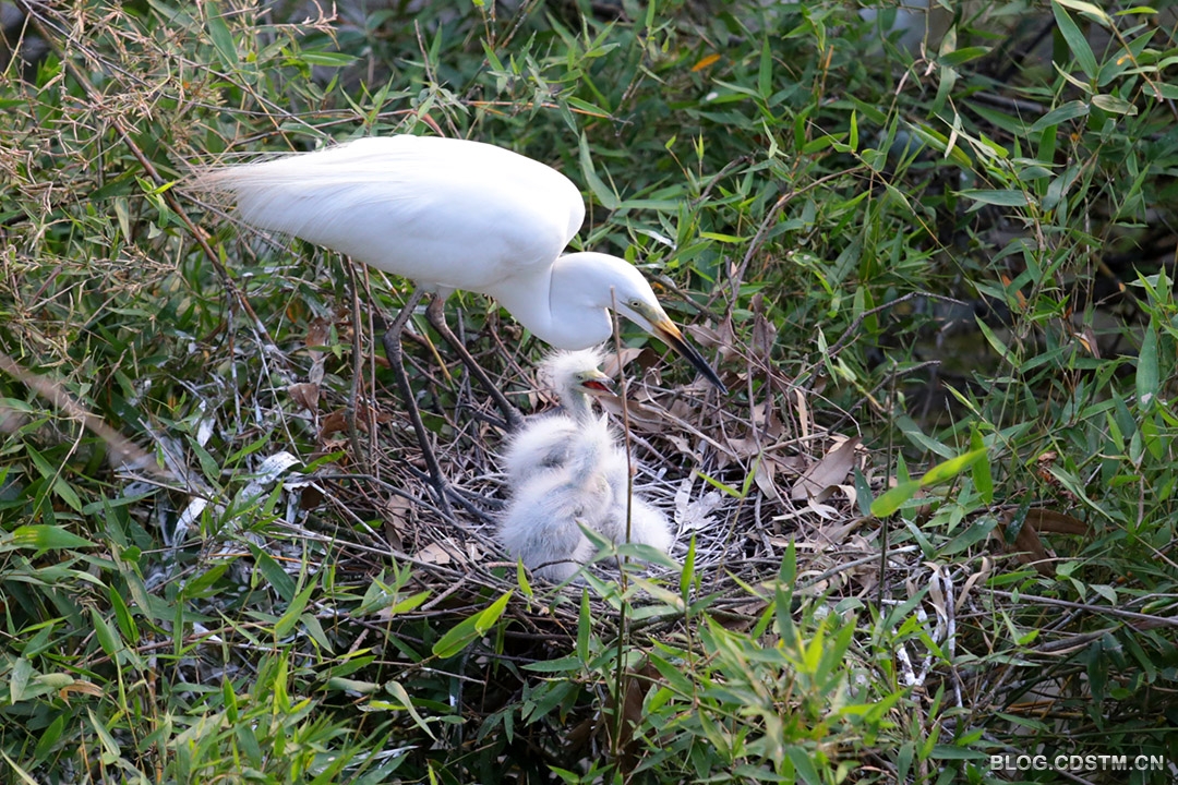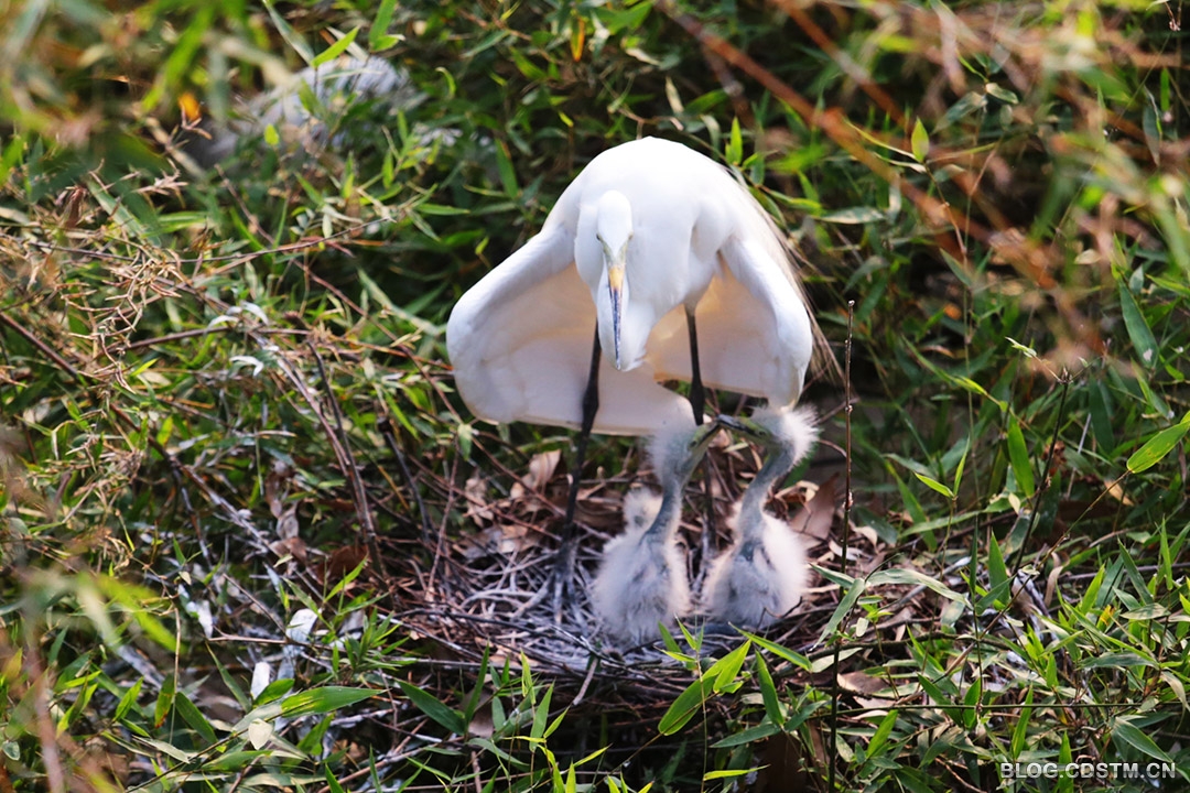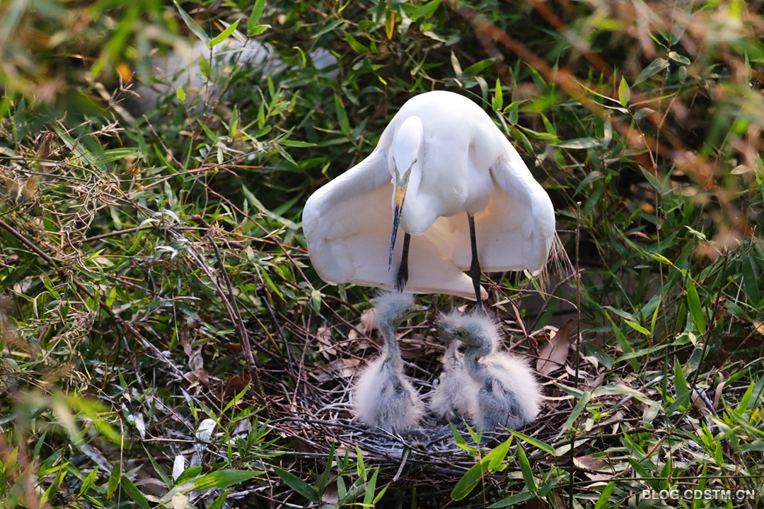 4月28日赴广西防城港红沙村拍白鹭,目睹白鹭妈妈和爸爸轮流照应鹭宝宝的情景,甚为感动。当天下午4点40分左右,在观鹭亭的三楼,看到一只鹭妈妈张开双翅,为鹭宝宝遮挡强烈的阳光,直到6点钟,基本没动,后来鹭爸爸从海边飞回来接班后,鹭妈妈才展翅飞去寻找食物。而鹭妈妈飞走后,鹭爸爸便担负起哺喂鹭宝宝的重任。