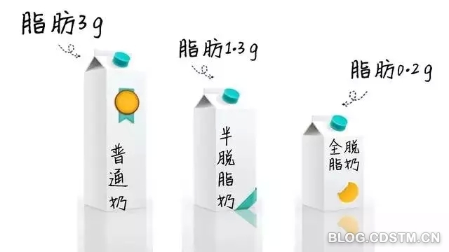 一般情况下,同为100 mL的牛奶中,普通奶含脂肪约为3 g,半脱脂奶约为1.3 g,全脱脂奶只有零点几克,可视为没有。