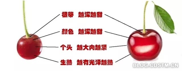 颜色:一般水果都遵循一个规律,昼夜温差越大,水果就会越甜。颜色深的樱桃一般较甜,颜色浅的大多发酸。