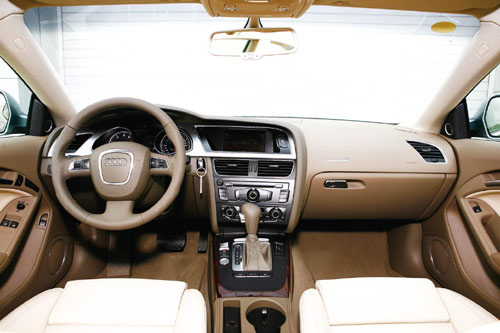 奥迪一向不会拒绝车主的特殊要求,对于A5,你可以选择两种材质的布料、两种材质的皮料、5种不同的镶嵌装饰以及大量的内饰色彩。另外,自动空调、MMI多媒体交互系统、带CD和独立显示屏的音响系统、可以自动打开的后行李厢盖、新型智能钥匙以及电子停车制动系统也都是新A5的标准配置。