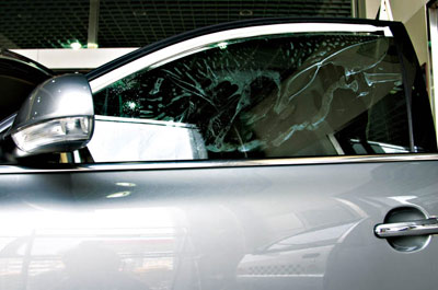 STEP 3:对需要施工的车窗玻璃进行清洗。这主要是为了杜绝贴膜后防爆膜与车窗玻璃之间存在污垢或者其他物体的施工质量问题。