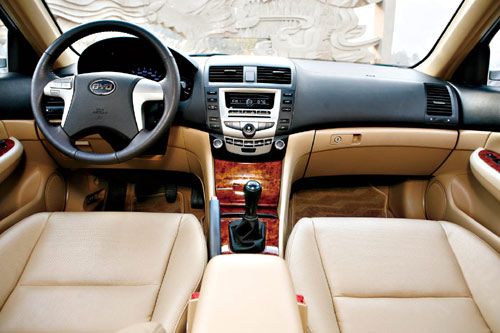 事实上,金玉其外,败絮其中是我最不愿意在自主品牌车型上看到的。F6的内饰与第七代雅阁的相似程度不仅仅体现在表面,细节的做工、均匀的接缝、仪表盘、中控面板甚至连电动空调开启控制键的位置都与第七代雅阁完全一致,而这些方面都体现着比亚迪F6在模具制造方面的优势。上深下浅的色调搭配让人感觉温馨而舒适,不过仿桃木饰件的使用却有些生硬。高配低价总让人感觉有节省成本之嫌,或许车内的异味从侧面解释了这一现象,F6车内的用料多以硬塑料为主,质感上未能提供与视觉一致的舒适。