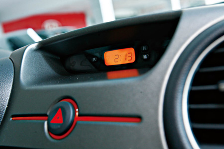9.中控台上方的时钟采用橙色背光,本以为这里应是行车电脑的所在,但如此大的一处空间却仅设置为时钟,多少让人感觉有些浪费