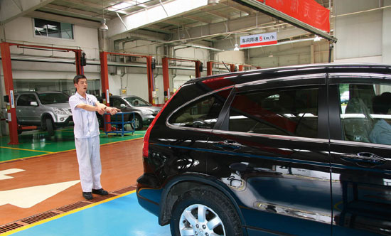 车灯打开以后,将灯光在墙面上的投影用粉笔记录下来,无论左右车灯都应该与汽车的正中的中轴线保持等距离。如果发生向外偏或者向内偏的现象,就必须根据汽车使用手册中的提示用螺丝刀来调整。至于车灯光束的高度,右车灯应该完全地水平直射,而左车灯则应该向上调高10cm左右。注意千万不能将车灯调校太高,这样会直射对面司机的眼睛。除了高度以外,车灯光照的宽度也可以调节,可以将右车灯光束调得略微向右偏,这样在能见度极低的雨天和雾天在右侧路面会看得更加清楚。