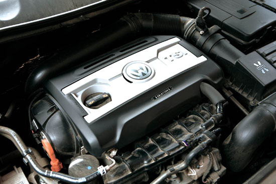 毫无疑问,迈腾2.0TSI的魅力在于2.0L的TSI涡轮增压发动机。目前迈腾所搭载的这台2.0TSI发动机属于大众汽车集团最新研发的EA888系列,由大众一汽发动机(大连)有限公司生产。这是继2007年1.8LTSI发动机在中国大连全球首发后,大众汽车集团向中国引进的又一款全球同步生产的发动机产品。相比之前的1.8TSI发动机,这台2.0L涡轮增压发动机同样采用了燃油缸内直喷技术,而最大功率提升了29kW,达到147kW,最大扭矩提升了30N?m,达到280N?m,而且这一峰值扭矩将在发动机转速1800~5000r/min之间始终保持。