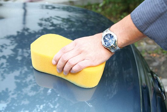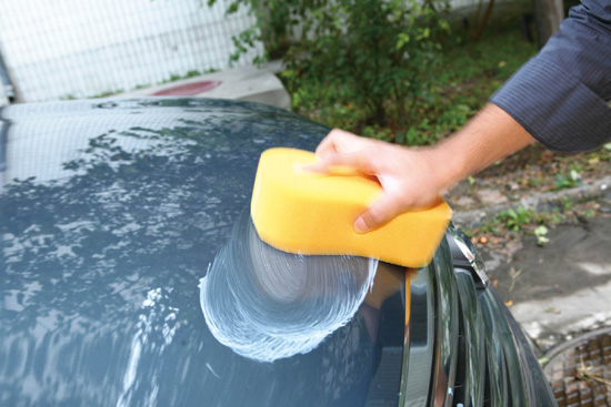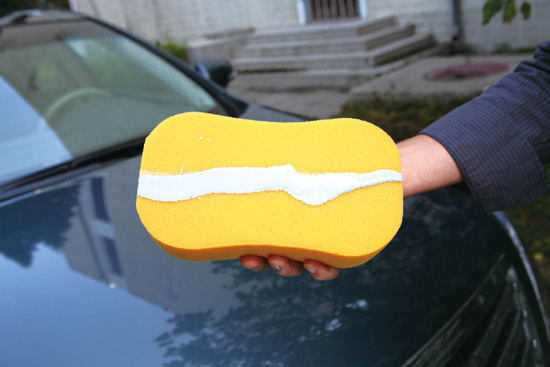第三步:待车身上的水迹完全干后,在打蜡专用的海绵上倒上一条蜡。