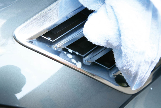 第二步:上蜡前应确保车身干爽,不能有残余水分。可以用吸水海绵或麂皮手工擦拭全部车身并注重边角等细节部分。