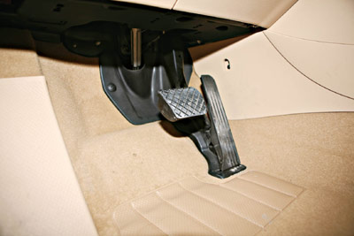 STEP2:检查液压制动系统制动踏板的“脚感”。踩下制动踏板,首先应能感觉出踏板的微小自由行程(符合各车型的要求),自由行程应在6~20mm之间。继续踩下踏板,踏板应有明显的阻力直至踩不动为止。如果踏板踩下去软绵绵的,没有明显的阻力,说明制动系统有故障应进行修理;如果踩下踏板时,第一脚踏板非常低,而第二脚却又恢复正常,但用力踩下踏板有微量的弹性,则表明制动管路里有空气,应排除制动液压管路中的空气。制动踏板踩到底时,制动踏板应与驾驶室地板之间保持一定的距离,该距离应符合车型的要求。距离过小,说明车轮制动器蹄片间隙过大,应调整车轮制动器的蹄片间隙。
