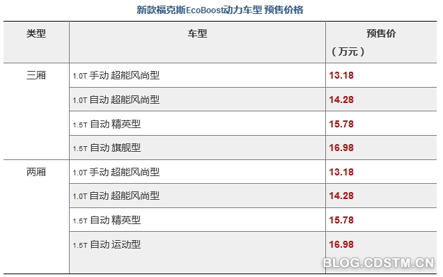 全新福特福克斯全系共16款车型于今日正式宣布预售。其中EcoBoostGTDi汽油直喷涡轮增压发动机车型有8款,预售价格如下: