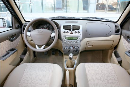 中控台的造型简洁,空调和音响等基本配置一应俱全。总体上它使用了大面积的银色面板,按钮醒目操作方便,音响还具备音频输入功能,方便车主外接MP3播放音乐。车门上的玻璃升降按钮通过“下压按钮”的动作来实现玻璃的上升和下降功能,容易发生误操作,在后排有儿童乘坐时,驾驶员最好锁定乘员玻璃开关功能。方向盘的调节功能较为简单,限制了不同身材的驾驶员找到合适的驾驶姿势。