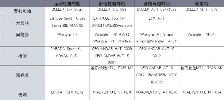 在各家轮胎生产厂家中,越野胎都是非常重要的一类产品线,下面我们就用表格的形式简单梳理一遍,供网友购买参考。