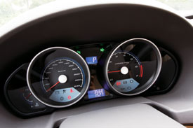 对于6万多元的轿车不必过分纠缠内饰的精细或者考究程度,持有这种心态的消费者往往能喜出望外。果不其然,骏捷FRV的内饰和它的大哥骏捷完全迥异,清新且干净利落。与低配的黑色中控不同,这辆1.6AT豪华型的中控台是银色的,很有白领阶层的气质,符合选择顶配车型车主的心理需求,特别是空调主控旋钮上还设置了小型液晶屏,非常有品味。中控台上各种按键的布置简单明了,便于操作,车主不会在寻找按键上浪费时间。仪表盘的设计也是大家所欣赏的地方,圆筒造型时尚动感,白色、蓝色和红色的搭配自然舒适,很有CIVIC的感觉,各种信息符号也很丰富,诸如挡位显示、安全带未系提示、车门打开等等。