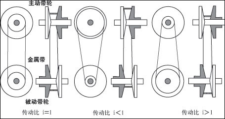 无级变速器(ContinuouslyVariableTransmission,简称CVT)有若干种分类,包括摩擦式、电传动式、静液传动式以及滑动离合器式,目前广泛应用的金属带式无级变速器属于其中的第一种类型。金属带式无级变速器由VDT公司取得重大突破,所以习惯上又称为VDT—CVT,其关键部件包括:金属传动带、工作轮、油泵、起步离合器、中间减速机构以及控制系统等。传动器的主、被动轮由固定和可动的两部分半锥轮组成,其工作面大多为直线锥面体,从而形成V型槽,与金属带啮合。当输入工作带轮的可动部分沿轴向外移动,输出工作轮的可动部分沿轴向内移动,使得输入带轮工作半径变小,而输出带轮半径变大,输出与输入带轮的工作半径之比变大,即传动比变大,反之,传动比将变小,由于工作半径大小变化是连续的,所以称之为无级变速。
