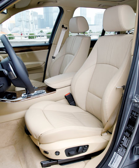 作为高配车型,宝马为xDrive35i装备了 3.0 L双涡管单涡轮增压发动机,这款编号 N55B30A的直6动力也是近年来发动机领域中的获奖专业户,获奖理由除了燃油直喷、全可变电子气门控制等先进技术之外,动力自然也是一个因素。但若与奥迪那款高功率版本的3.0T动力比较,N55B30A的225 kW最大功率并不耀眼,真正值得惊叹倒是这款发动机出色的扭矩特点。在1 200~5 000 r/min 转速下400 N·m的峰值扭矩可持续输出,也就是说,无论你是低速跟车,还是高速巡航,发动机时时刻刻都会在扭矩上给予你最大的支持。xDrive35i在强劲动力的驱使下,从静止加速至100 km/h仅需5.7 s,这个成绩甚至胜过了许多外形“拉风”的轿跑车。