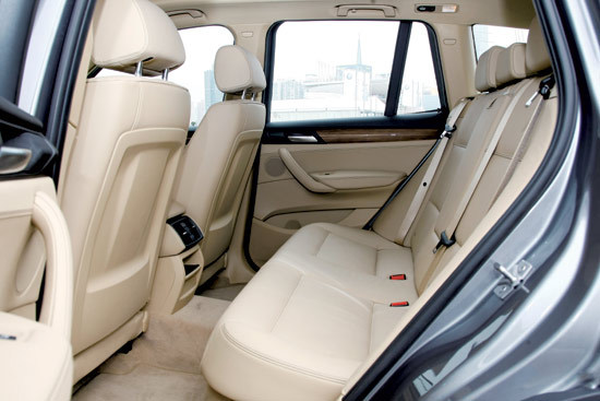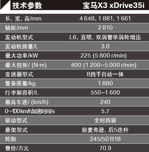 出于定位考虑,新X3肯定会在尺寸上有所顾忌,但稍微“长大”一点也是必须的。较上一代,新X3 的长、宽、高分别增加了79 mm、28 mm、14 mm,而最终的4 648 mm车长以及2 810 mm轴距与奥迪Q5极其接近,同时也小胜于奔驰GLK。操控性无疑是宝马的强项,但在多功能性方面X家族却体现出了十足的固执,虽然新X3的后排座椅靠背可按4:2:4比例折叠, 行李厢可提供550~1 600 L的空间,但整体乏善可陈,没能表现出对手奥迪Q5那般积极进取的学习态度来。