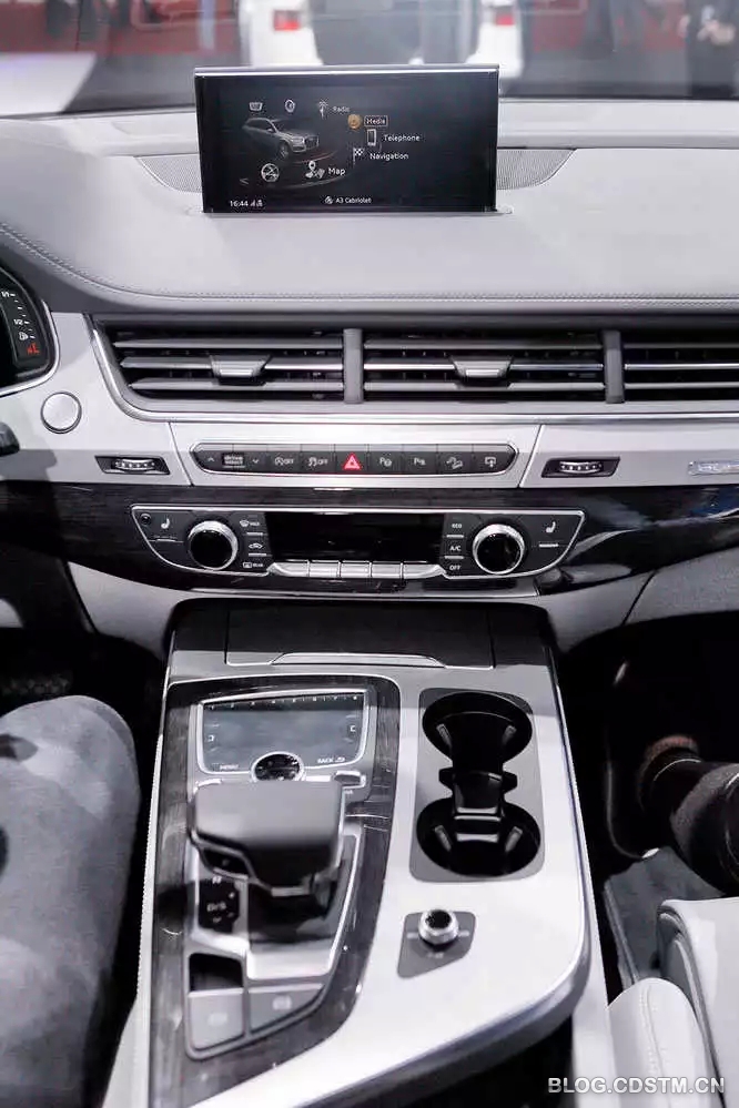 微微倾向驾驶员的中控面板在样式设计上非常后现代化,与现款相比较可以用脱胎换骨来形容。贯穿整个面板的空调出风口是一大特点。从实拍图来看,内饰配色为上深下浅。官方称,全新Q7将提供有7种配色方案。