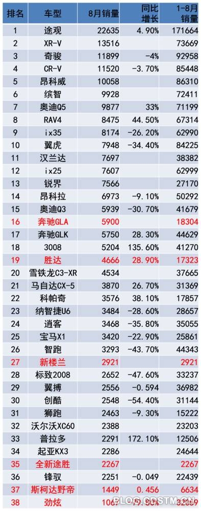 8月合资品牌SUV销量排行榜 新车型发力 整体小幅下滑