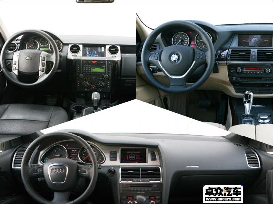 在内饰设计方面,三者之间的差别同样明显。路虎发现3保持了相当英武的感觉,在高坐姿的帮助下获得了最为理想的视野,再加上为三排乘客分别设计了三个独立的天窗,将这种豁达的感觉发挥到极致。相比之下,Q7和X5的乘坐感觉就要更加偏重轿车化,尽管视野受到一定影响,但是舒适性要好了很多。而奥迪Q7的中控台被设计得向驾驶者方向略有倾斜,操作便利性较为突出。从乘坐舒适性角度来看,宝马X5的表现要略显突出。首先是前排电动座椅的柔软程度和支撑力都很理想,而且调节方式的丰富程度也是三者当中最为出色的。从人机工程的角度考虑,宝马X5短小而且造型独特的变速器手柄和方向盘,保障了驾驶者拥有最为舒适的驾驶感觉。