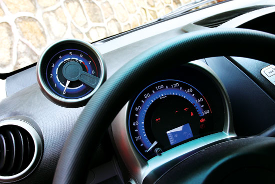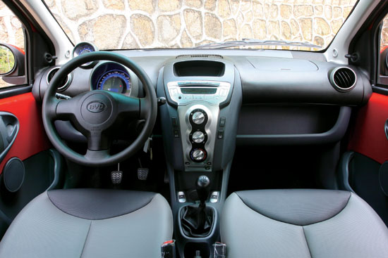 我们还在比亚迪F0的车内找到了很多别出心裁的设计,整体黑色为基调的风格颇有几分与国际接轨的意思,向外突出的中控台极大地增加了音响和空调等功能区操作的便利性,而手动空调控制旋钮上下一字排开的设计也显得相当前卫。比亚迪F0车厢内最显眼的部分莫过于其独特的仪表设计,转速表和车速表与方向盘一道被安装在转向柱上,并可以随之一起上下调节,颇有几分MINI的感觉,而数字式燃油表则进一步提升了该车的科技感。值得一提的是,F0的空调出风口采用了球形360°内嵌式设计,操作起来非常方便。