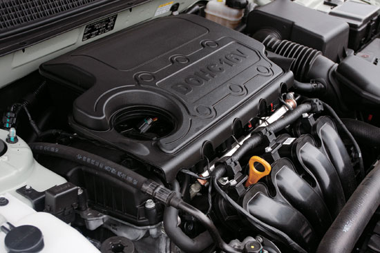 动力系统的改变是此次北京现代推出SONATA领翔的绝对亮点,现代、三菱和克莱斯勒在上一代θ发动机获得出色成绩的基础上联合推出了最新的第二代产品。SONATA领翔采用了2.0L和2.4L两个同档次车型当中的黄金排量,由于都采用了双CVVT技术,两者在动力性和经济性等方面均得到了相当程度的提升。其中2.0L新款发动机拥有121kW的最大功率,相比第一代发动机提高了14kW,这样的成绩即便是和第8代雅阁、凯美瑞等绝对主流车型的2.0L发动机也有着相当的竞争实力,而197N·m的最大扭矩,相比竞争对手也有着一定的优势。而第二代θ2.4L发动机在同排量的竞争对手面前尽管优势不如2.0L产品那样明显,但整体性能也算得上佼佼者了。变速器的选择方面,SONATA领翔显然是追求了驾驶的舒适性和便利性,所有产品中只有最低端的2.0L车型有5挡手动变速器,其余2.0L车型则装备了4挡手自一体变速器,而2.4L车型则全部标配了最新的5挡H-Matic手自一体变速器。