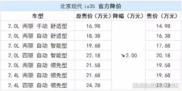 此次北京现代只针对现款ix35的价格进行了统一调整,但该车的配置相比此前并没有改变。动力系统方面,新车依旧搭载2.0L或2.4L自然吸气发动机,传动系统与发动机匹配的是6速手动或6速手自一体变速箱。