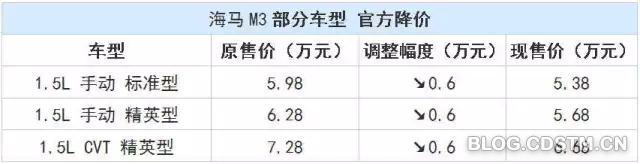 此次官方降价以及在售车型调整后,现款海马M3仅售的三款车型分别是1.5L手动标准型、1.5L手动精英型以及1.5L CVT精英型,三款车型降价后的配置相比此前并未调整。除此之外,目前海马M3还有两款七彩领航版在售,售价分别为6.48万元与7.48万元。动力系统方面,新车搭载的是1.5L自然吸气发动机,最大输出功率112马力,峰值扭矩147牛·米。传动系统与发动机匹配的是5速手动或CVT变速箱。