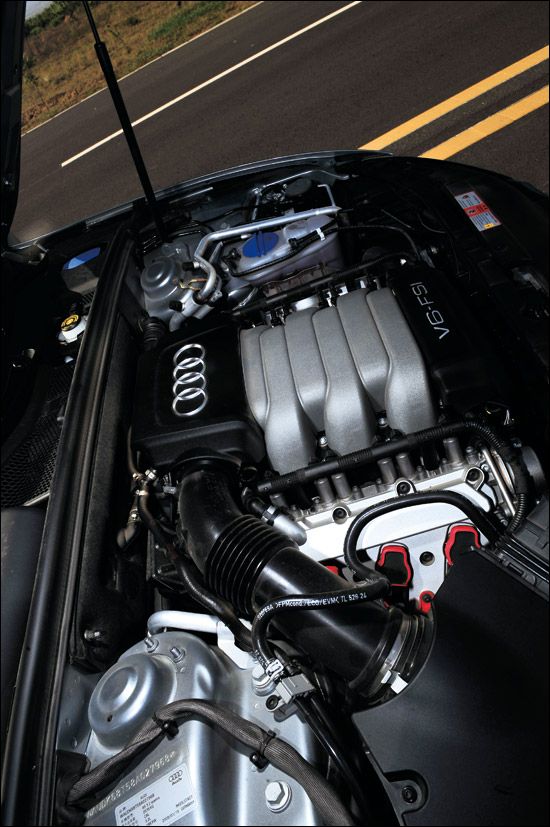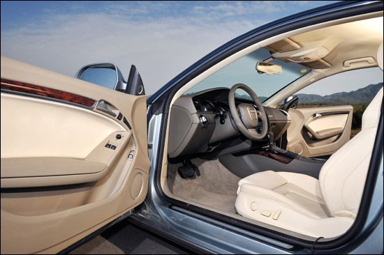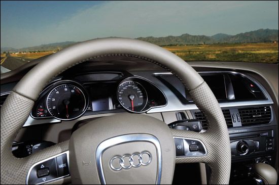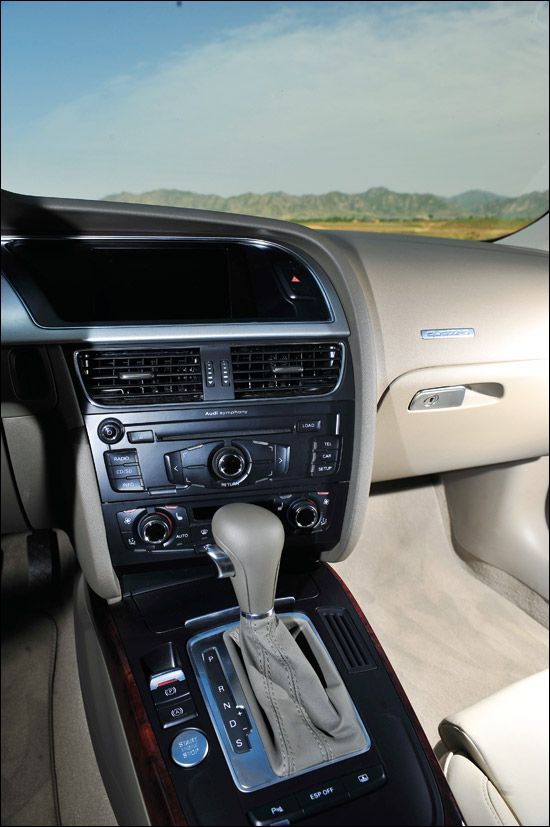 在大陆销售的奥迪A5目前只有两款车型,3.2L FSI发动机,6挡Tiptronic手/自一体变速器,“quattro”或者非“quattro”。我们很“不幸”地拿到了quattro版,它让我们将大把的时间花在了驾驶上,而不是研究其他功能。我从一上车就告诉自己只有2个挡位可以选择,S或者M,虽然在D挡状态下,你可以用拨片随时介入手动模式,但稍不留神又会被打回原型,谁还会在D挡上浪费时间。而前两者的区别则在于你是否愿意更多地聆听发动机6?000~7?000r/min的轰鸣,或者享受略微自主的挡位控制,A5的电脑会在转速超过红线后自动升挡而非断油。FSI发动机依旧反应敏捷,你可以想象成自己在用意念控制车速,因为你感受不到迟滞。不过我还是要抱怨一下,纵置的V6发动机使我不得不又一次错过了DSG变速器,即使Tip tronic也还不错。