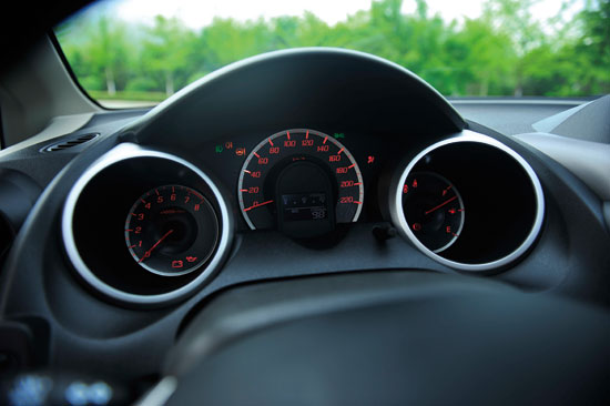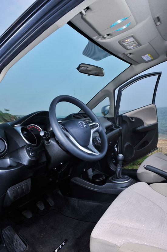 这些尺寸上的变化在你进入车内的时候不会有特别突然的直观感受,或许是因为原来的飞度已经足够宽敞了。不过当你坐在方向盘后面的时候,你却可以突然感受到视觉空间的敞亮,A柱被缩小了,三角窗面积扩大到了以前的3倍,虽然这些还是无法完全消除角落里的一些盲区,但增大的10%的前方视野却更加令人舒适。而在内后视镜里,新的嵌入式后排头枕使后视野增大了30%,整个后风挡玻璃没有丝毫的阻碍,甚至连外后视镜的范围也扩大了16%。在这里你体会到的绝对是一个宽松而愉悦的加大码。