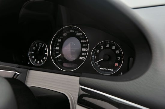 中控台并没有因为AMG的介入而改用碳纤维材质或进行音响系统的升级,奔驰的COMAND系统依旧操作繁琐。仪表盘的变化不仅在于增加了AMGLogo,转速的红线区提升,最高车速也锁定在了320km/h,不过在电子限速的限制下,即使你拼尽全力也只能达到250km/h,有没有办法解锁呢?德国人应该有办法,不过我们却没有他们那样的不设限高速,所以,老实点为妙。最为有趣的还在于仪表板左侧的“大视野”钟表,我甚至一度把它误认为了设计超前的双指针转速表,难道AMG的工程师害怕驾驶员在高速飞驰下观察自己的左腕导致危险吗?不明就里。