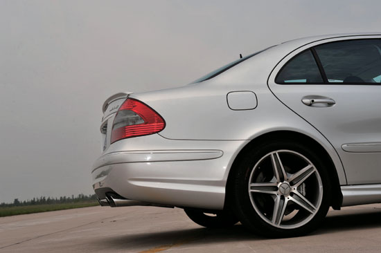 E63AMG在外观上的变化远不如在性能上的提升,这也许是因为AMG永远将目光集中在发动机性能提升,而非一些炫目的造型。E63采用车身包围套件并不夸张,你不用过于担心前导流板是否会因为一个几厘米高的沟坎而报废,而在车头两侧的鲨鱼鳃形进气口,还是很好地向人们展现了它的狂傲之气。不过E63最能吸引人还是它硕大的轮圈,漂亮的五辐造型,配合其中若隐若现的带有AMGLogo的刹车卡钳,让人心生敬畏。而也正是在这样剽悍的制动系统保证下,我敢于把速度突破200km/h的关口。