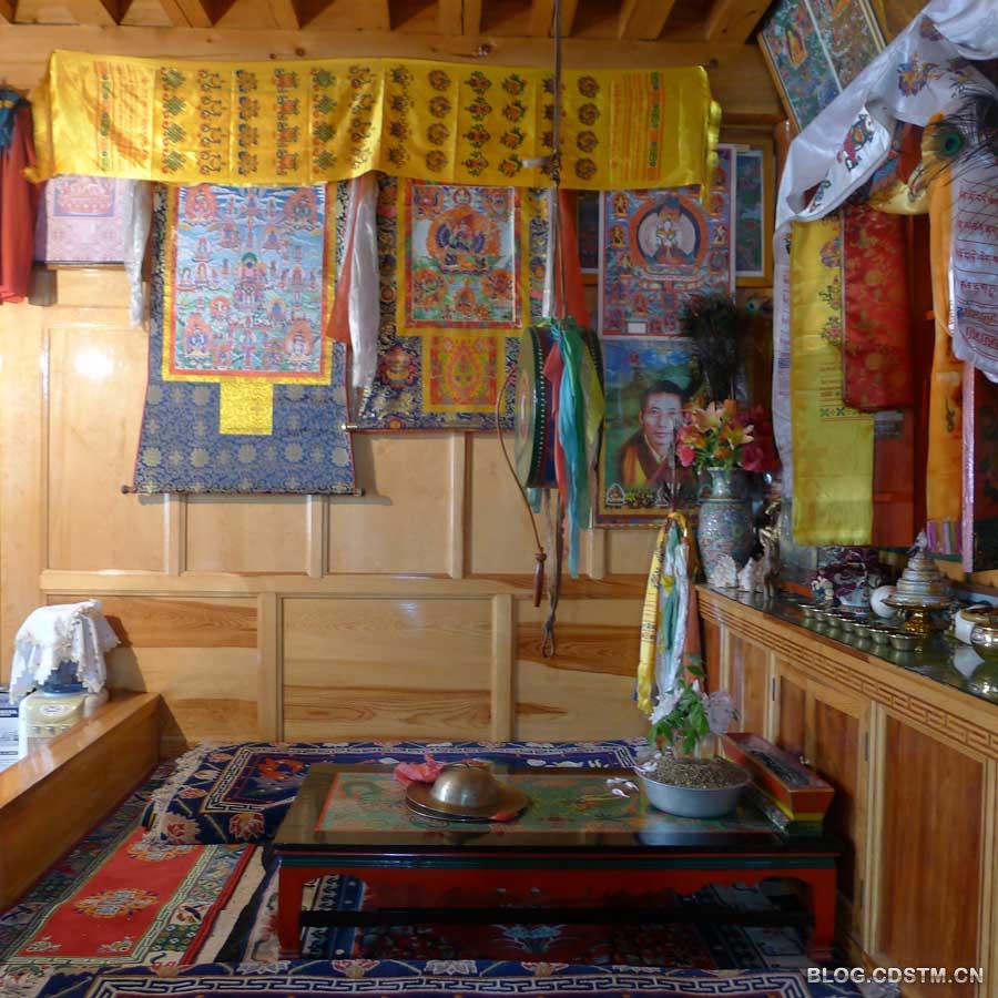 2013-05-23 15:07:17一对老年夫妇把我们热情地迎进了屋里,我们也得以看到了普通藏族人家屋子的摆设。正如带我们来的张老师介绍的那样,藏族房子是“屋外不见木,屋里不见砖”,屋子里包括地板、墙壁、家具全是木质的。房间里的摆设全是藏族风味的,包括祭祀的神像,墙壁上的画以及垂下来的彩带,有种初入殿堂的感觉,所以不知所措。