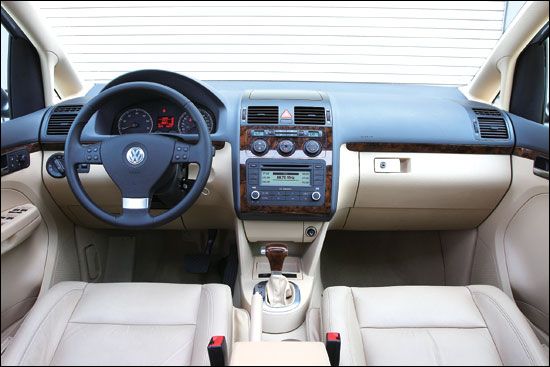 新途安在内饰方面严格贯彻了大众汽车的高品质路线,各部件间连接紧密,做工也很精细,无论是视觉效果还是触觉效果,都可与高档车相媲美。规矩整齐的大众式中控台上,桃木装饰点缀得恰到好处,这也成为新老途安内饰部分的最大差异所在。老款途安在储物空间上的人性化设计优势在新途安身上得到了延续,遍布车内的储物盒多得让人感觉是在变魔术,以至于要对大大小小的储物盒分门别类,才不至于在迫切需要的时候找不到某件物品。