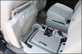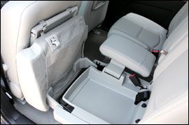 打开马自达5的侧拉门,最先映入眼帘的是前排座椅背后的小桌板上一个带托底的杯架,虽然设计比较简单,开口也不大,但是小号的饮料瓶、太空杯都适用。回想起新途安小桌板上也有类似的杯架,不过说通俗点只能算是一个做工讲究的窟窿,因为没有托底,所以只能放下类似有锥度的纸杯,适用范围被局限了很多。再从前到后数一数,马自达5为每一个位置都设计了杯架,虽然只是些几乎算不上配置的小物件,但是对车内的每一个人都如此关爱,看来设计者还是费了不少心思。不过真正让马自达5设计师们费心思的,还要算是6+1座椅布局方式了,而6+1的精妙之处就隐藏在第二排这两个充满玄机的座椅中。掀起右侧座垫,一个相当实用的带杯架的小桌板隐藏在这里,向左边翻出桌板后,座垫下方形成了一个不错的储物空间。+1的变化集中在左侧座椅上,同样掀起座垫,从这里可以翻出加座的坐垫,加座的靠背在座椅的右侧边,只需几个简单的动作,第七个座位就布置好了。只是这个富于魔幻色彩的加座座椅面积比较小,乘坐感觉基本谈不上舒适,由它的变化所产生出的实用价值反而更大一些。