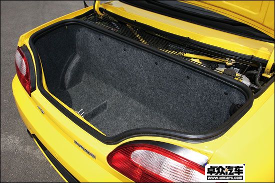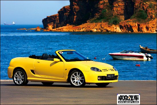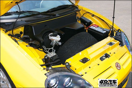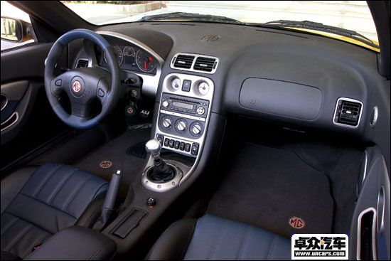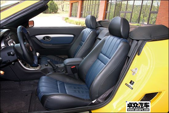 既然是跑车,相信不会有人再去要求它更多与追求速度、操控无关的东西,就像TF简洁规矩的内饰,虽然车内配置对于MG TF来说不算丰富,但是电动窗、双气囊、电动后视镜、CD音响这样的基本配置倒还齐全。被中置发动机占据了大部分的行李厢,剩下的210 L空间也足够放下两个中型的旅行箱或是一套高尔夫球具,而车头部分的空间则被备胎、蓄电池、刹车助力泵等部件所占据。从车内到车外,似乎每一个零件上都写着“为速度服务”。当然也包括软顶敞篷这个“杀伤性武器”。对于被硬顶家轿“虐待”惯了的驾驶员来说,突然间一辆两门两座的敞篷跑车摆在面前,相信所有人都要先体验一下被风吹乱了头发的感觉。只需打开两个连接在风挡上沿的扣锁,将帆布软顶轻松地折叠在座椅后方,即可与大自然亲密一把。