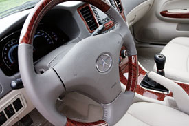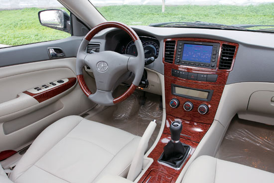 “后来者集大成”这句宣传语可以算是宾悦轿车的真实写照,而且在外观上已有所体现。坐进车里,宾悦整合世界资源的感觉更加强烈。第一个窜入视线的是由伟世通提供的与凯美瑞出奇相像的仪表盘,两个白色背光的马蹄形主仪表指示清晰,虽然没有液晶显示屏所提供的信息丰富,但是各项状态标识依然齐备。上灰色下米色的内饰色彩搭配,视觉效果清晰而不跳跃,控制面板上的“桃木”装饰板向下延伸至变速器挡杆基座,百利德方向盘上以及车门扶手上的“桃木”装饰,在色彩上的点缀效果更强一些,完全可以忽略是不是豪华的真木。