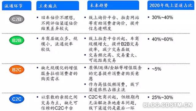随着互联网的发展,线上渠道影响了二手车消费者的购车决策路径,二手车交易逐步从以“车”为核心向以“人”为核心转变。消费者开始逐步开始网上看车、多方比较、注重售后服务的交易方式,并逐步接受上门检测等线下服务,而交易市场仅仅成为购车过户的最后一环。未来,线上渠道将助力于解决各环节痛点,有望引领“2B”环节的流通,但仍然无法取代交易市场等线下渠道在“2C”最后一环的重要作用。