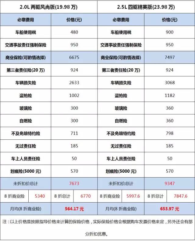 注:以上价格是按照指导价格来计算的保险价格,实际保险价格会根据购车发票价格来定,另外还会有部分折扣优惠。