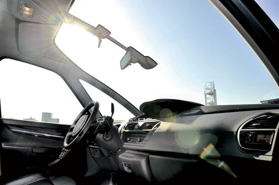 雪铁龙C4毕加索是第一款将超宽视野前风挡作为标准配置量产的车型,而这片平滑玻璃却将我们的视野增加了一倍。我们的垂直视角——就是从前风挡最低点到最高点的角度达到了70°,传统的车型都是35°,然而为了继续开拓视野,前风挡上部的车顶横梁比一般车型后移了30cm多,于是带给了我们无与伦比的宽阔视野。我突然想到,如果是夏季或者对着太阳行驶如何应对刺眼的阳光,抬头的瞬间我发现了创新的滑动式遮阳板,通过滑动它可以把C4毕加索的视野缩小到普通车辆的程度。