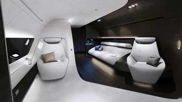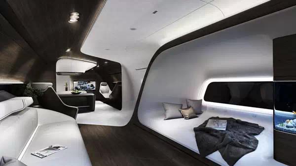 奔驰设计部门公布了豪华VIP飞机的内饰图,内饰设计极其简约,具有科技感,配以天花板造型,还配备大屏电视、鱼缸等装置,飞机的舷窗采用电子变色玻璃。