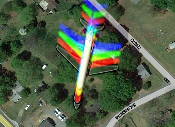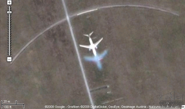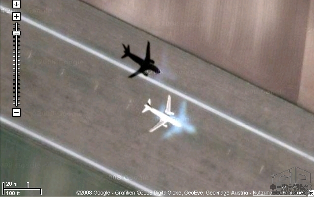 由于飞机的影子实在难以观察,所以这个问题也就无法进行探讨。可是,有一天我跟同事聊天时,他说在查看通州卫星地图时,看到了一架飞机。他的话给我一个启发,我可以通过google地图的卫星照片来看飞机的影子。我很快在google地图上找到了正在飞行的飞机,可是它们的影子让我有了意想不到的发现。