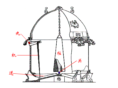 在新复原的地动仪中,“都柱”被换成了悬垂摆,这样“都柱”可以做得很大、很重。“都柱”下面的小球叫“关”,“都柱”受到震动后,推动“关”,“关”沿着“道”滚动碰撞“机”,“机”再释放龙嘴里的“丸”。
