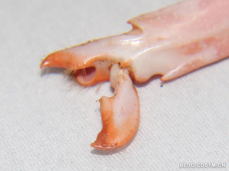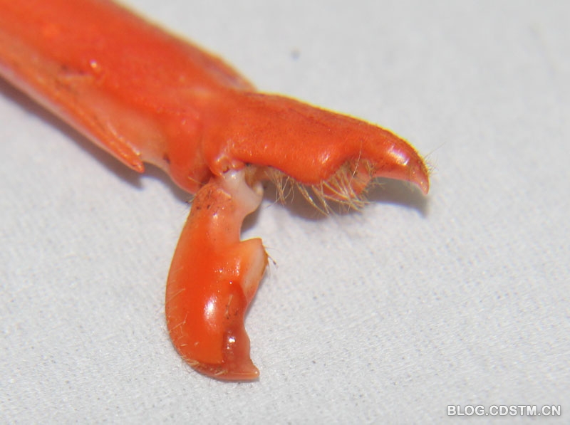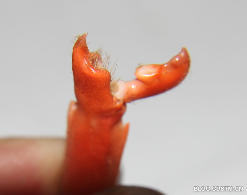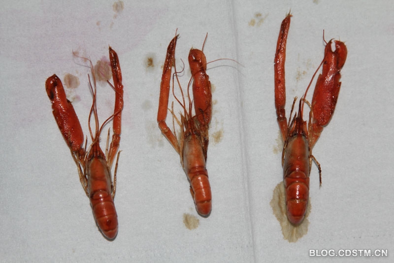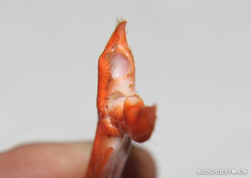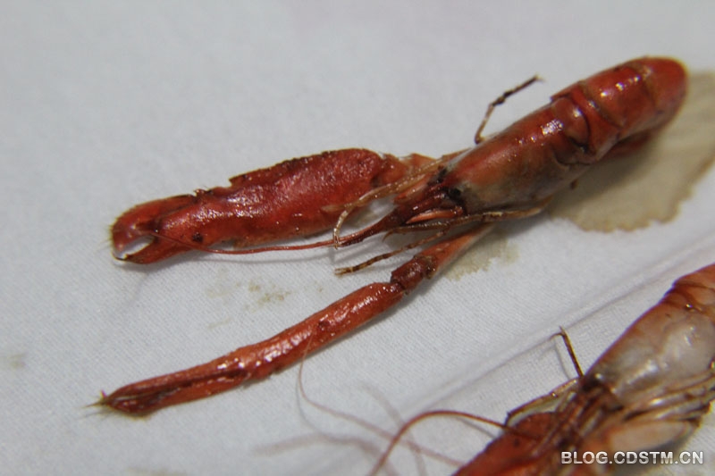 今天的晚餐有一盘虾,是我爱人从超市买来的。吃第一只的时候,我就注意到这虾有点怪,它的钳子左右不对称,一大一小。一开始我想可能畸形吧,可是我看了一下其它的虾,都是这样。我突然想到这会不会是传说中的鼓虾呢?我仔细看了较大的那只虾钳的结构,越看越像,细节非常吻合。没想到我第一次见到大名鼎鼎的鼓虾,竟然是在这样的情景之下。