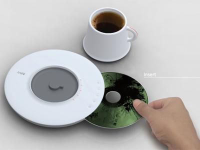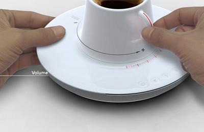 这是一款可以播放CD的茶杯。将CD插入杯盘内,当茶杯放在杯盘上时就开始播放音乐,旋转茶杯可以调节音量大小。
