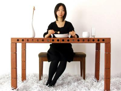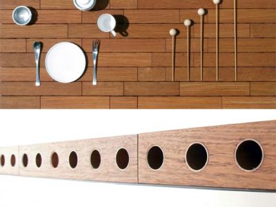 这款餐桌通过敲击可发出不同的音调,有点类似木琴,侧边的小孔便是出音口。