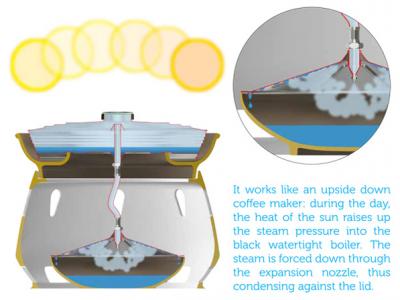 意大利一名设计师设计了一个太阳能蒸馏净水器,价格是同类产品的一半,工作效率则高出67%,可以广泛用在缺少淡水的沿海贫困国家和地区。净水器的工作原理跟咖啡壶非常相似,通过太阳光将上方的盐水加热成蒸汽,此时产生的压力将蒸汽压至下方的陶瓷锅中,然后再重新液化成水。和传统的净水器相比,它不需要过滤器和电能,操作简便,一天大约能生产5升的饮用水。